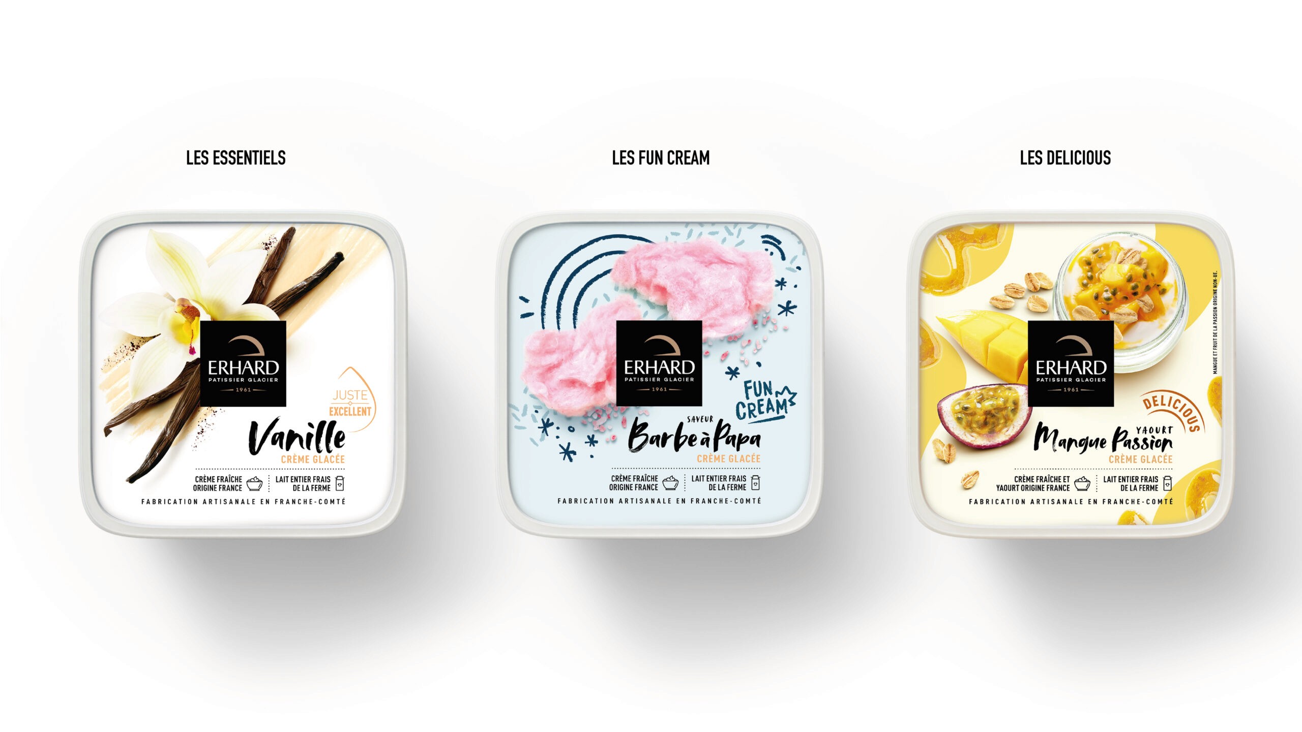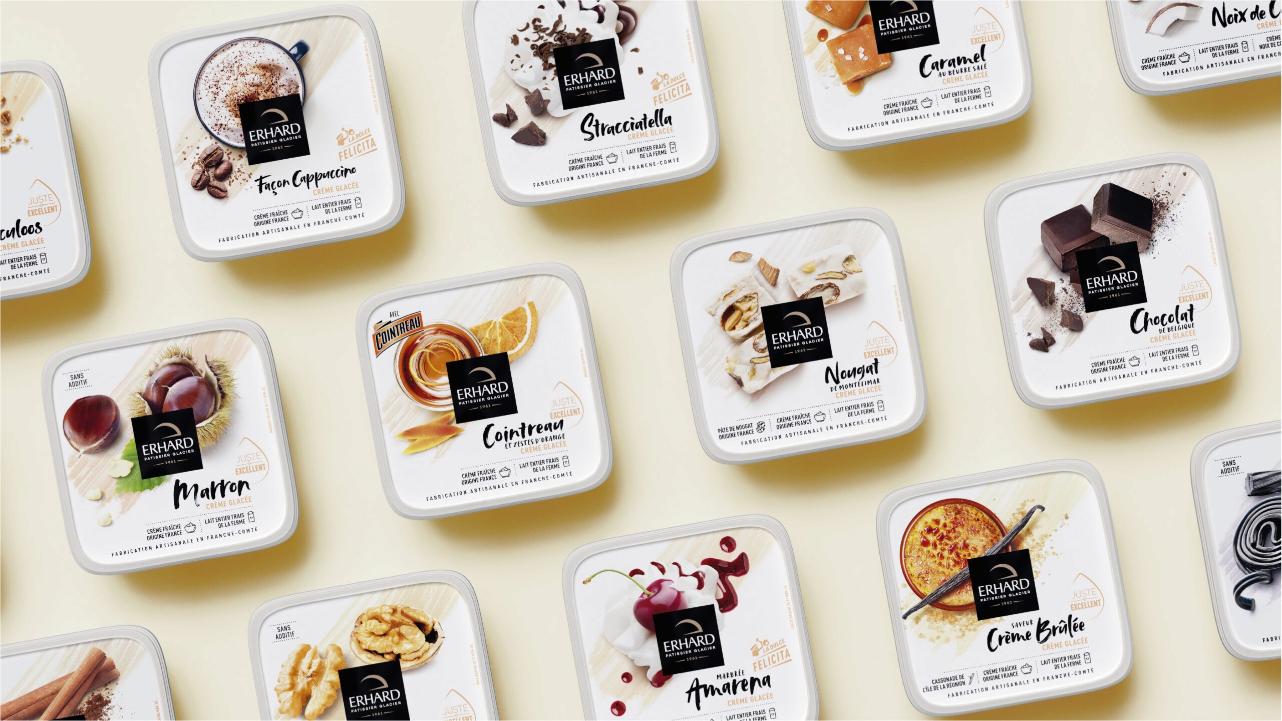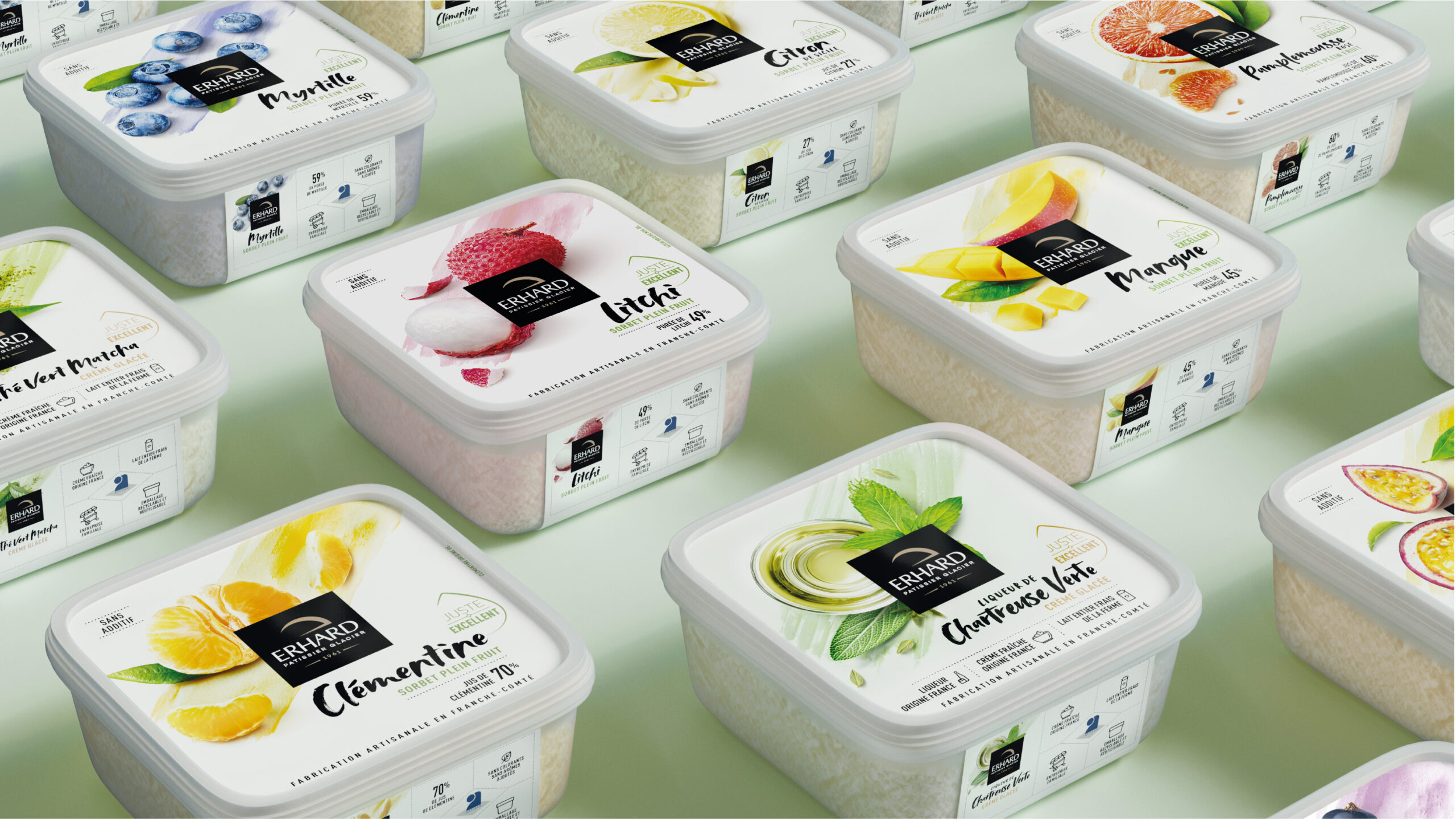 Erhard has crafted ice cream in Franche-Comté since 1961. With over 60 SKUs to redesign, the challenge was to create a system flexible enough to cover the entire range while ensuring each flavor feels generous, artisanal, and honest. The solution was simple: let the ingredients lead. Shot from above, raw and abundant, each composition tells its story before you read the name. A visual language that celebrates quality through clarity, not excess. The result is packaging that feels as good as the product tastes.