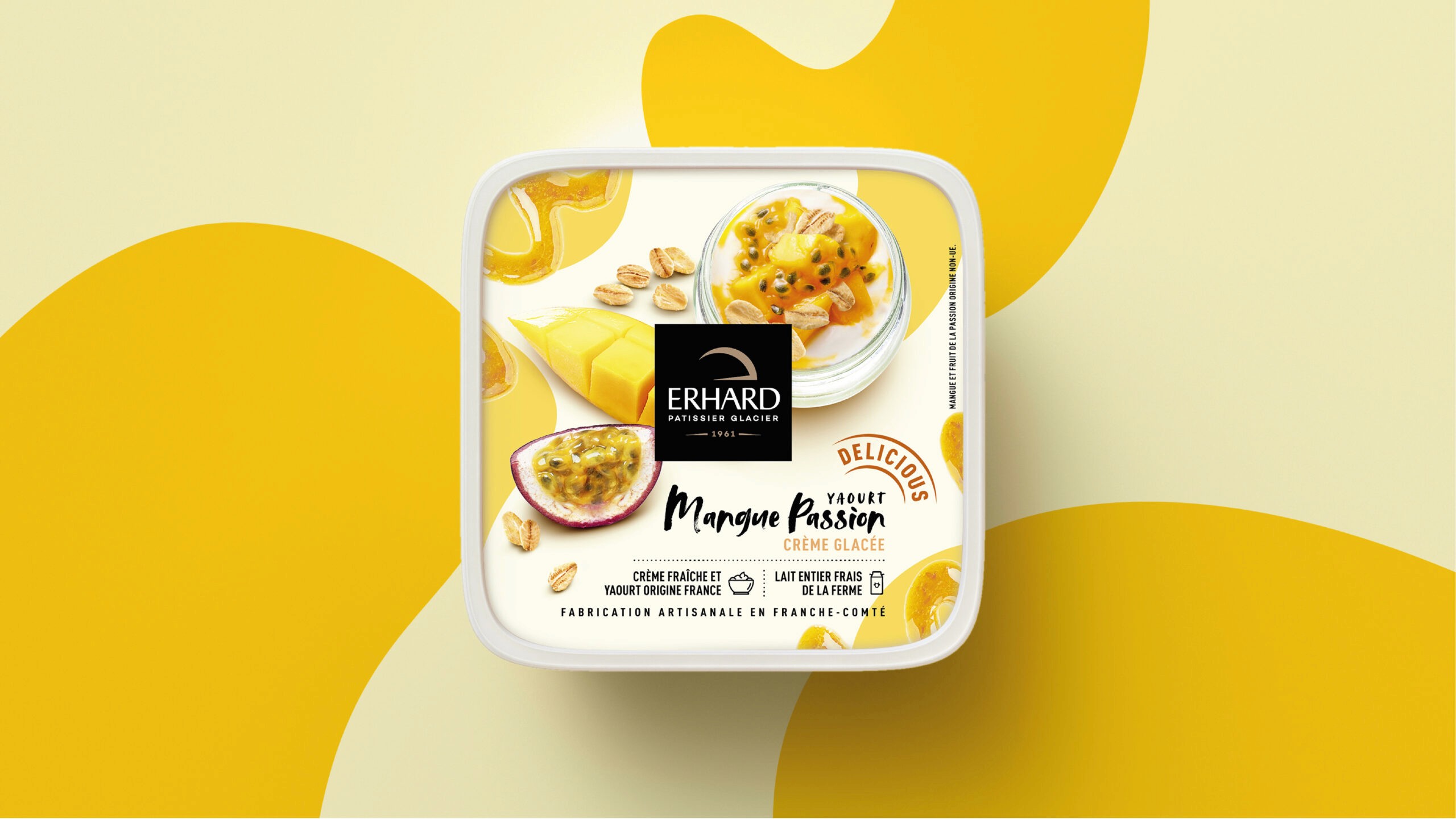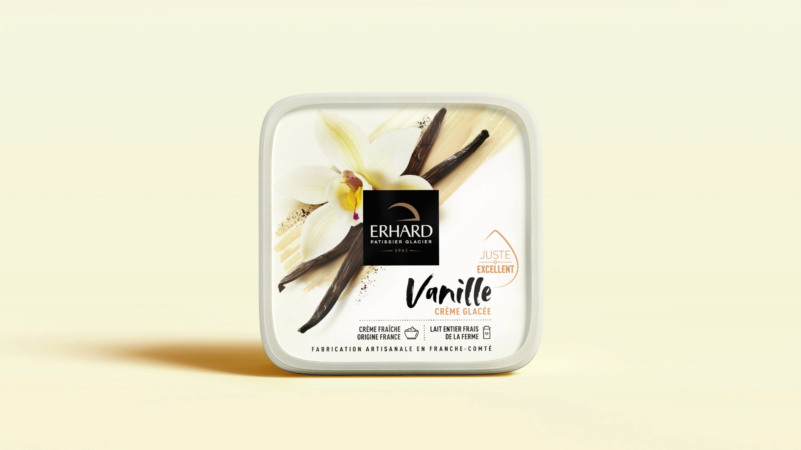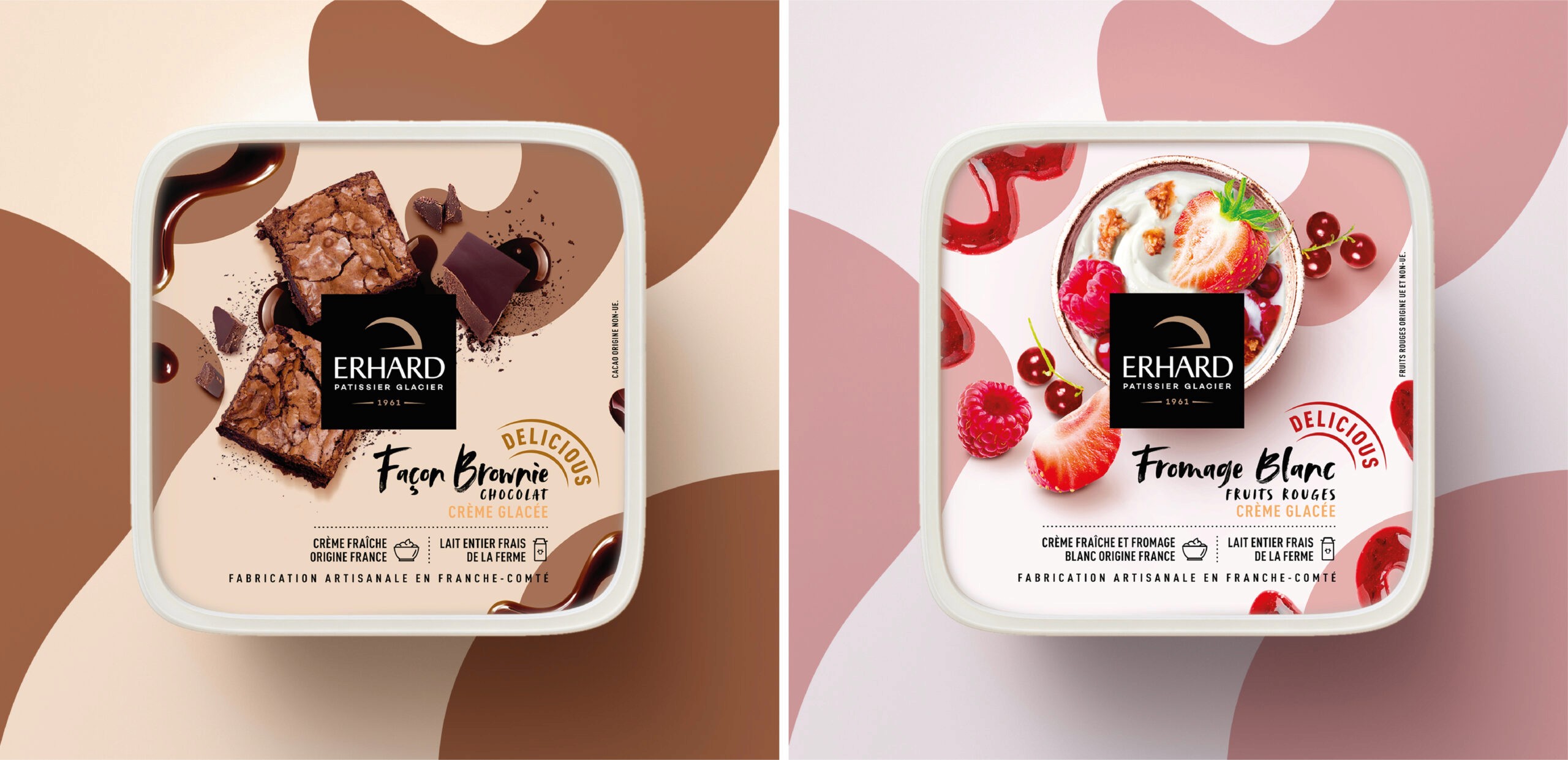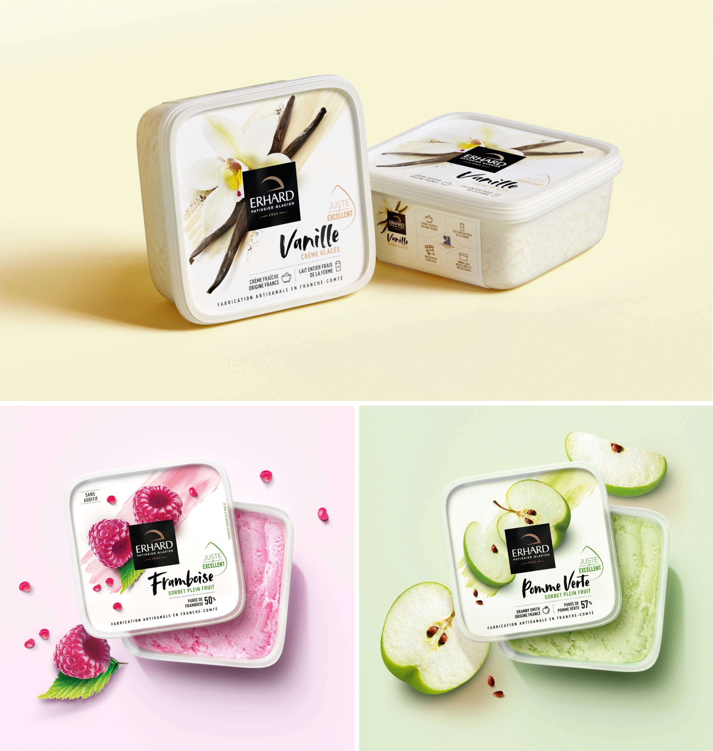 Erhard has crafted ice cream in Franche-Comté since 1961. With over 60 SKUs to redesign, the challenge was to create a system flexible enough to cover the entire range while ensuring each flavor feels generous, artisanal, and honest. The solution was simple: let the ingredients lead. Shot from above, raw and abundant, each composition tells its story before you read the name. A visual language that celebrates quality through clarity, not excess. The result is packaging that feels as good as the product tastes.