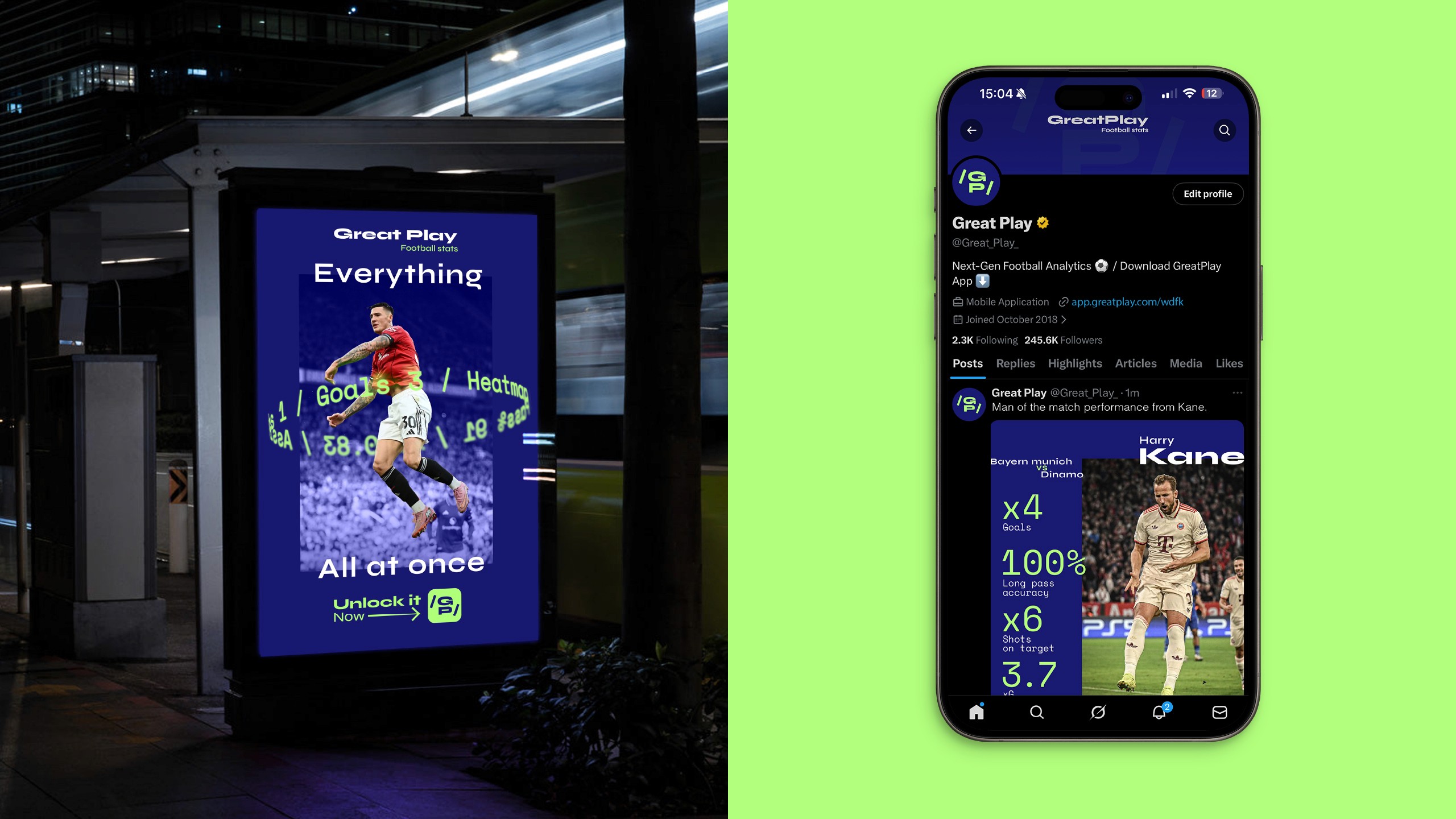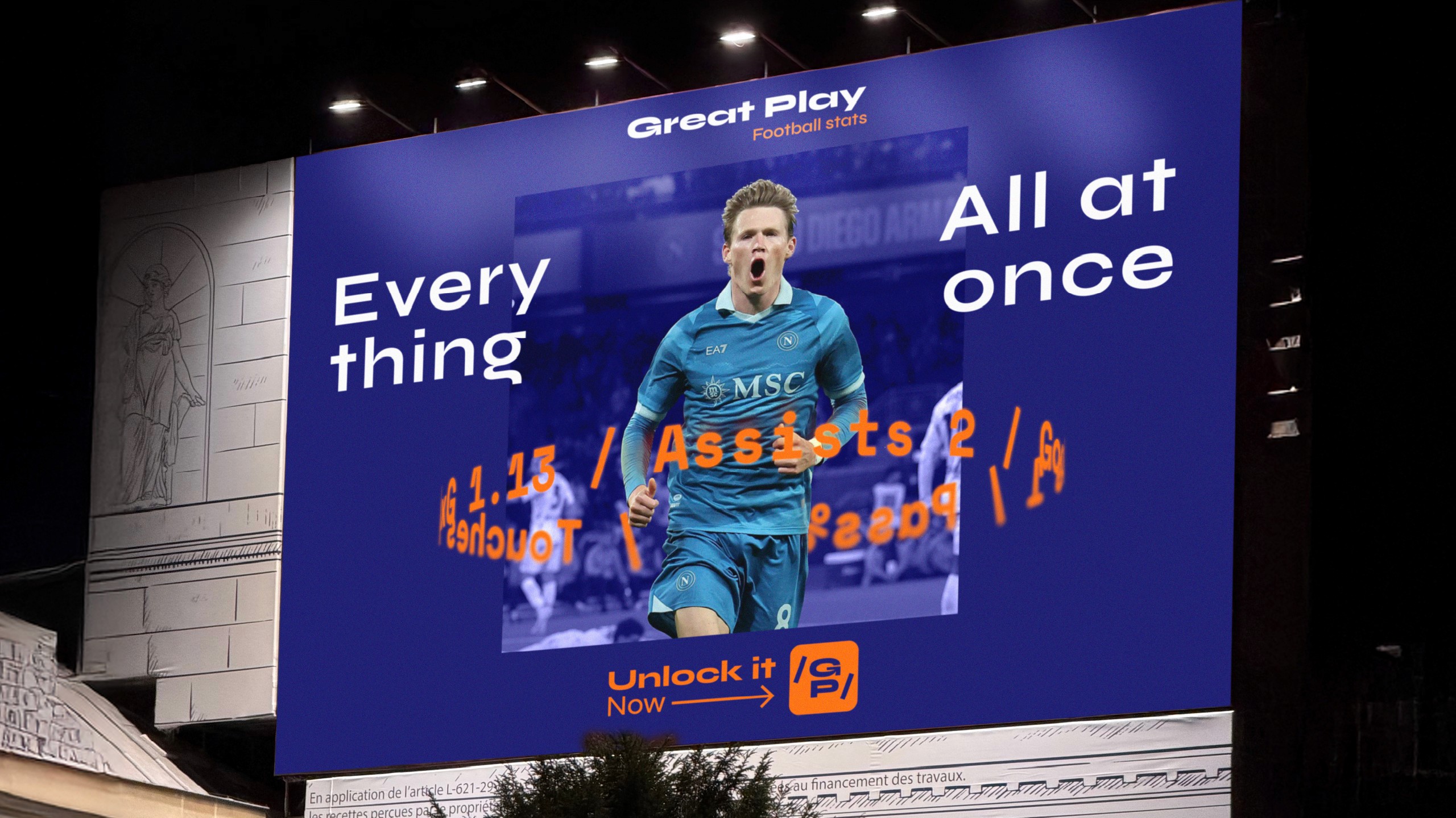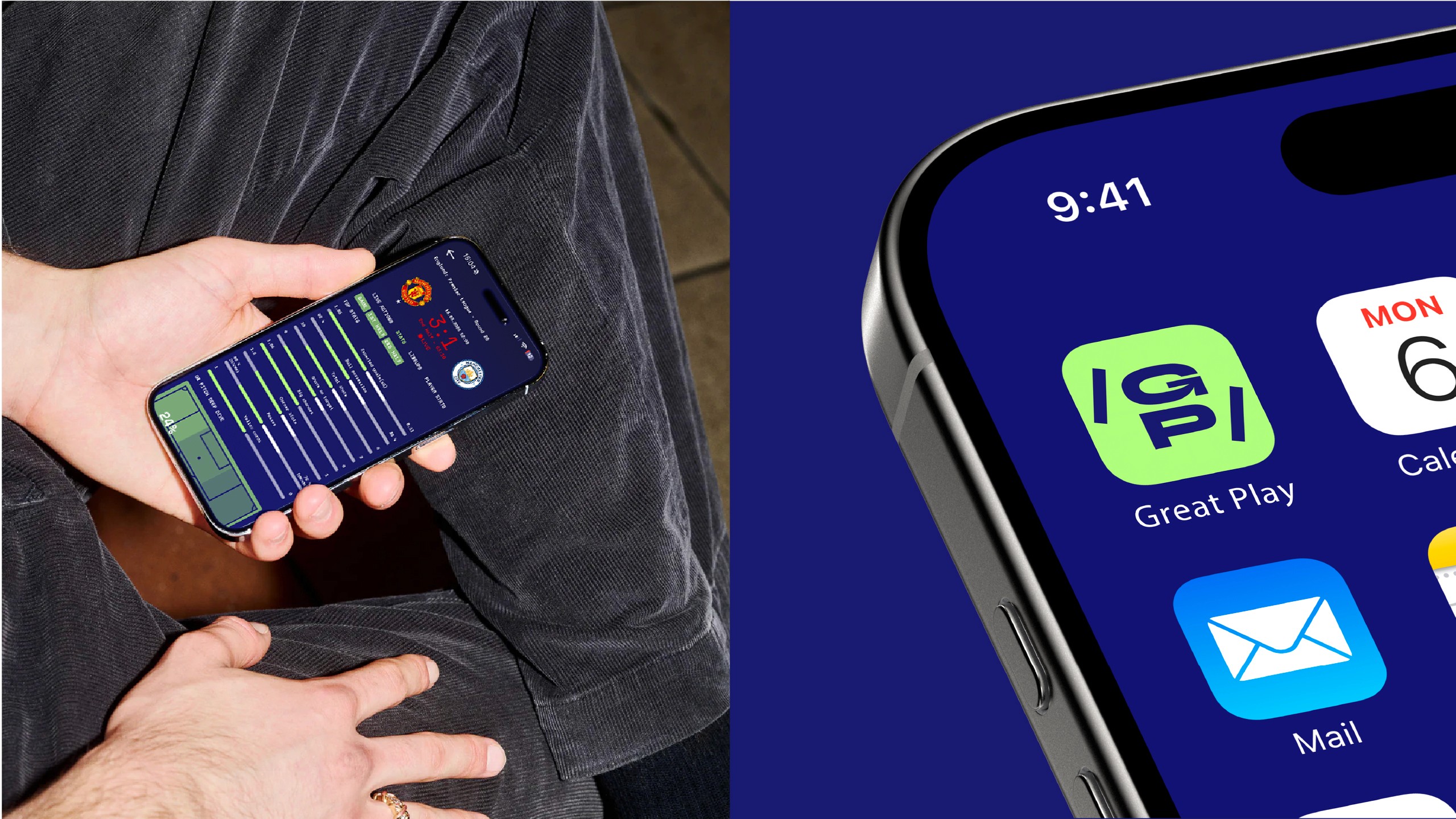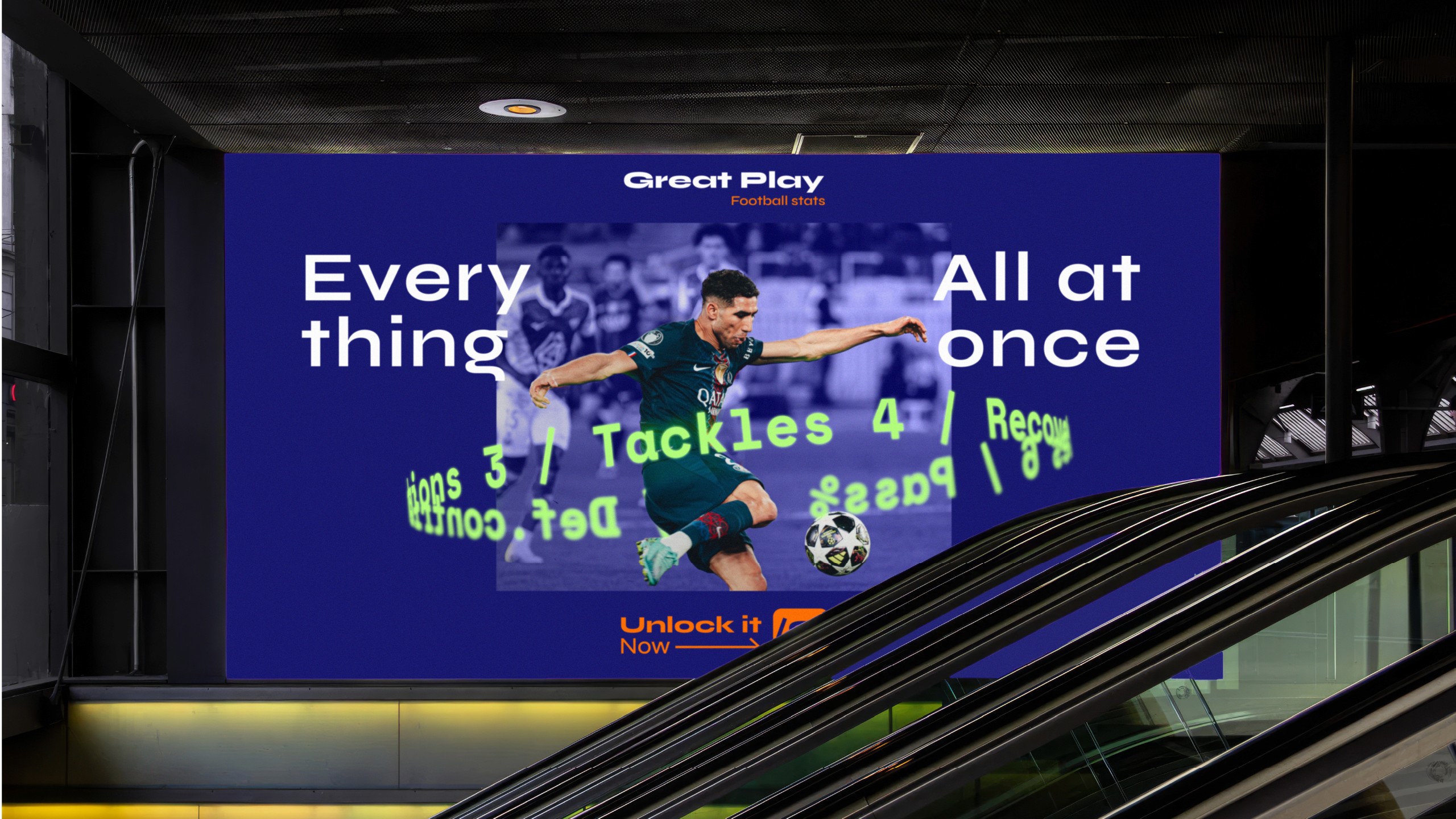 Football moves fast. The brand needed to keep up. It started with one insight: when a player sprints at full speed, the world tilts. That perspective became the core of everything. The slashes in the logo aren’t just decoration; they represent a point of view. This isn’t confined to screens or billboards. It’s where the brand truly lives: in the stadium. Unlike most sports apps that feel like dashboards, Great Play is designed to feel like being in the game, live, sharp, and impossible to ignore.